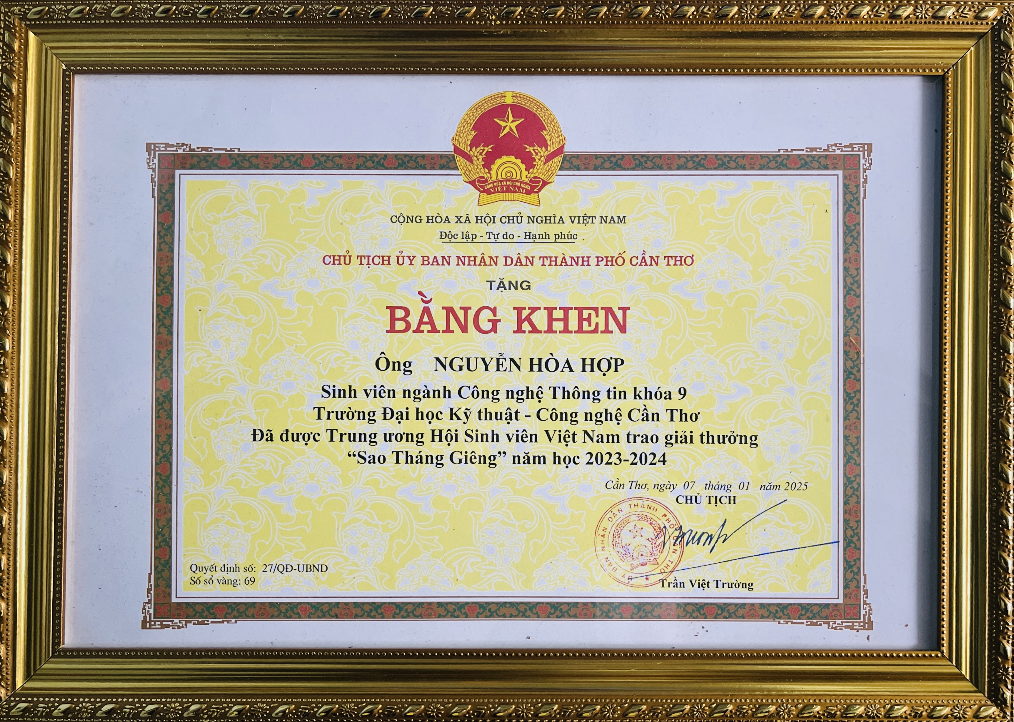 Bằng khen Đã được Trung ương Hội sinh viên Việt nam trao giải thưởng Sao Tháng Giêng năm học 2023 - 2024