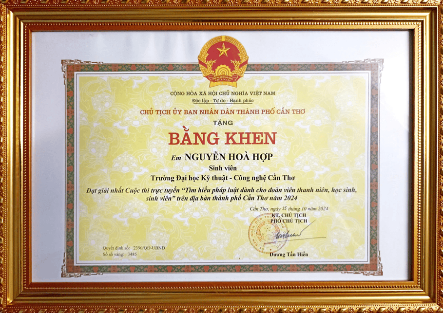 Bằng khen Đạt giải Nhất Cuộc thi “Tìm hiểu pháp luật dành cho đoàn viên thanh niên, học sinh, sinh viên” năm 2024