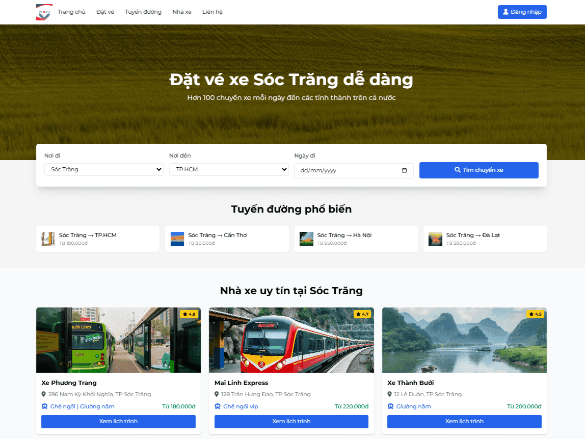 Không còn phải truy cập nhiều trang web hay gọi nhiều số điện thoại. VéXeST tổng hợp lịch trình của tất cả các nhà xe uy tín tại Sóc Trăng vào một nơi duy nhất. Bộ lọc thông minh cho phép bạn tìm kiếm chuyến đi hoàn hảo theo:
